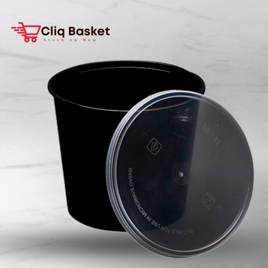 CliqBasket 1200 ML Black Plastic Round Food Container with Lid – Kitchen Storage Box (25 Pack)