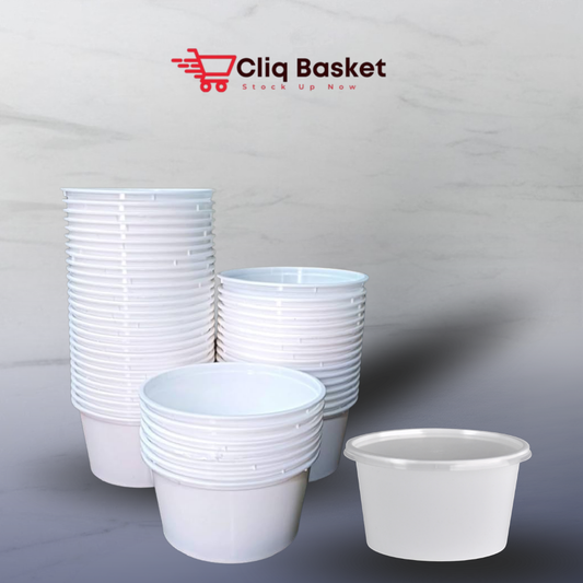 Explore round plastic food storage Round containers at CliqBasket in 100 ml, 250 ml, 500 ml, 750 ml, and 1000 ml sizes. Available in white, black, and transparent colors with sets of 10 and popular sets of 25, perfect for kitchens, meal prep, and food packing.